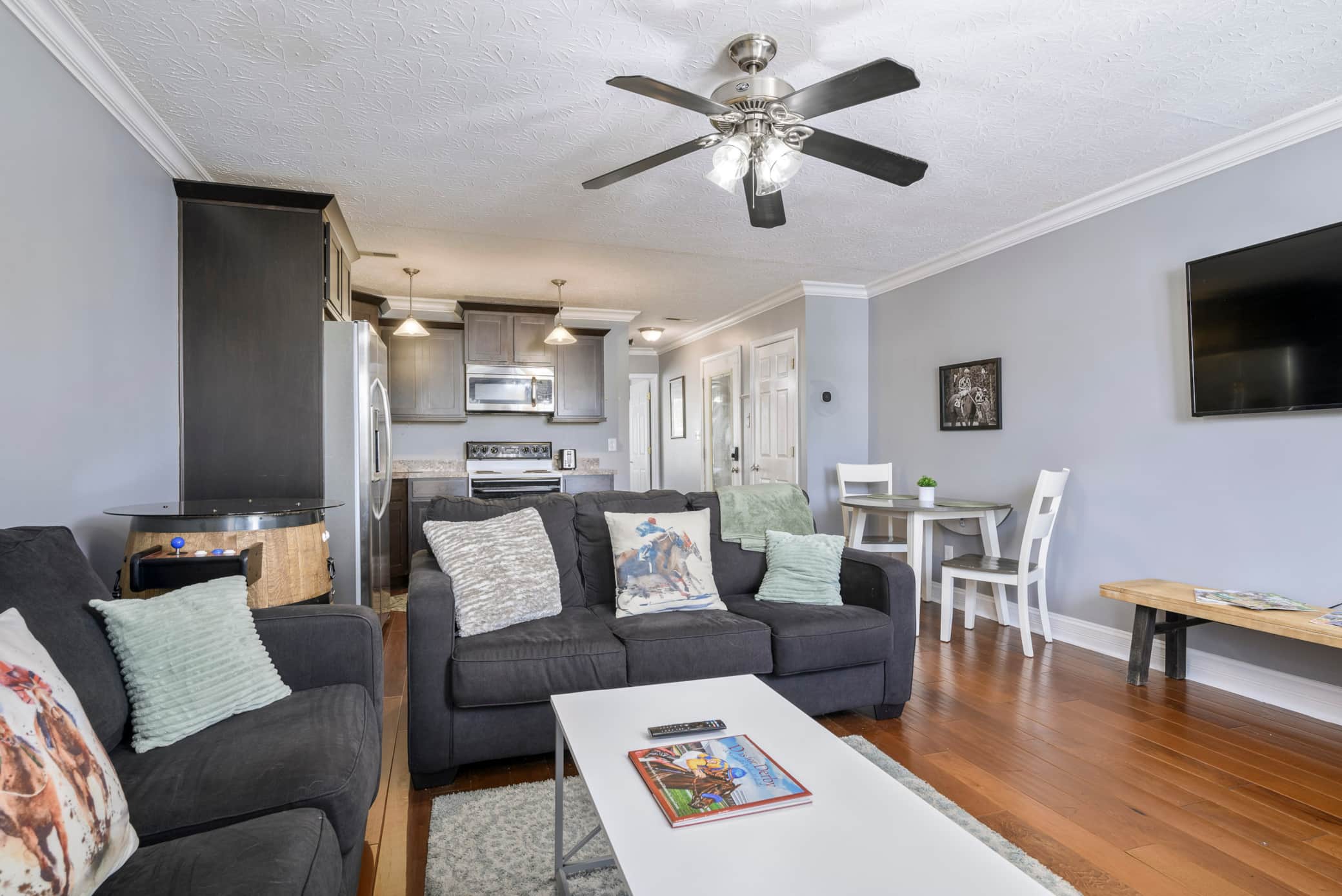 Secretariat Twin Spries Suite!!! 1 Bedroom 1 Bath Suite with 2 hideaway bed couchs. Completely updated and is in great condition. There is a game machine that has first and 2nd generation video games! Large shared balcony. Sleeps 6! Washer and Dryer! Full kitchen. Location is walking distance from nightlife in downtown Jeffersonville. 10 Min to Louisville Airport. 10 min from churchill downs.